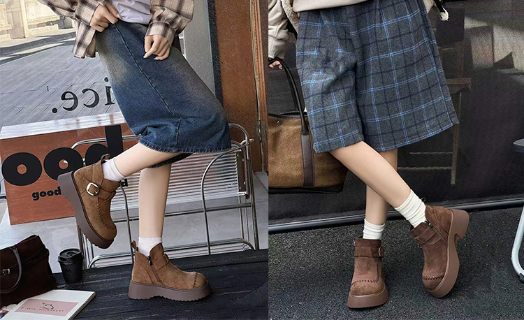 👢حذاء قصير مصنوع من الجلد الطبيعي بنعل سميك بتصميم عتيق منسوج
