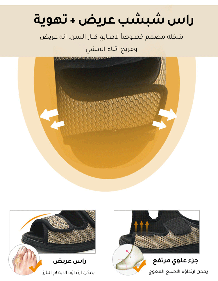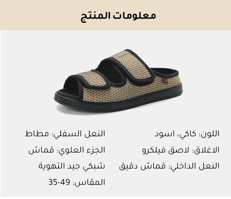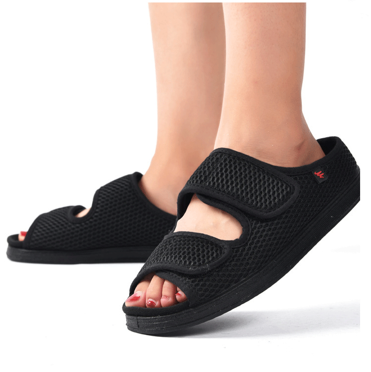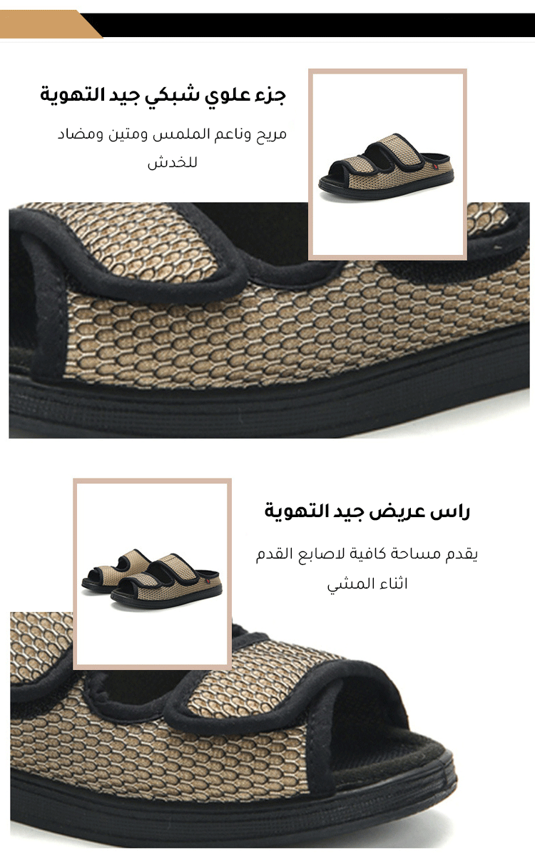 حذاء مصمم بحزامين عريضين قابلين للتعديل، يمكن ضبط درجة المرونة بسهولة. مثالي للأقدام المتورمة، والعظام الناتئة، والمتعافين من الجراحة. لا يضغط على القدم ولا يحصرها، مما يجعل الارتداء والخلع أكثر مرونة. قماش شبكي عالي المرونة يمنع التعرق في الصيف، مناسب لمرضى السكري والأشخاص الذين يتعرقون بسهولة. تصميم مفتوح عند أصابع القدم يمنع الضغط على الأصابع، ويخفف من مشاكل العظام الناتئة والالتهابات. |