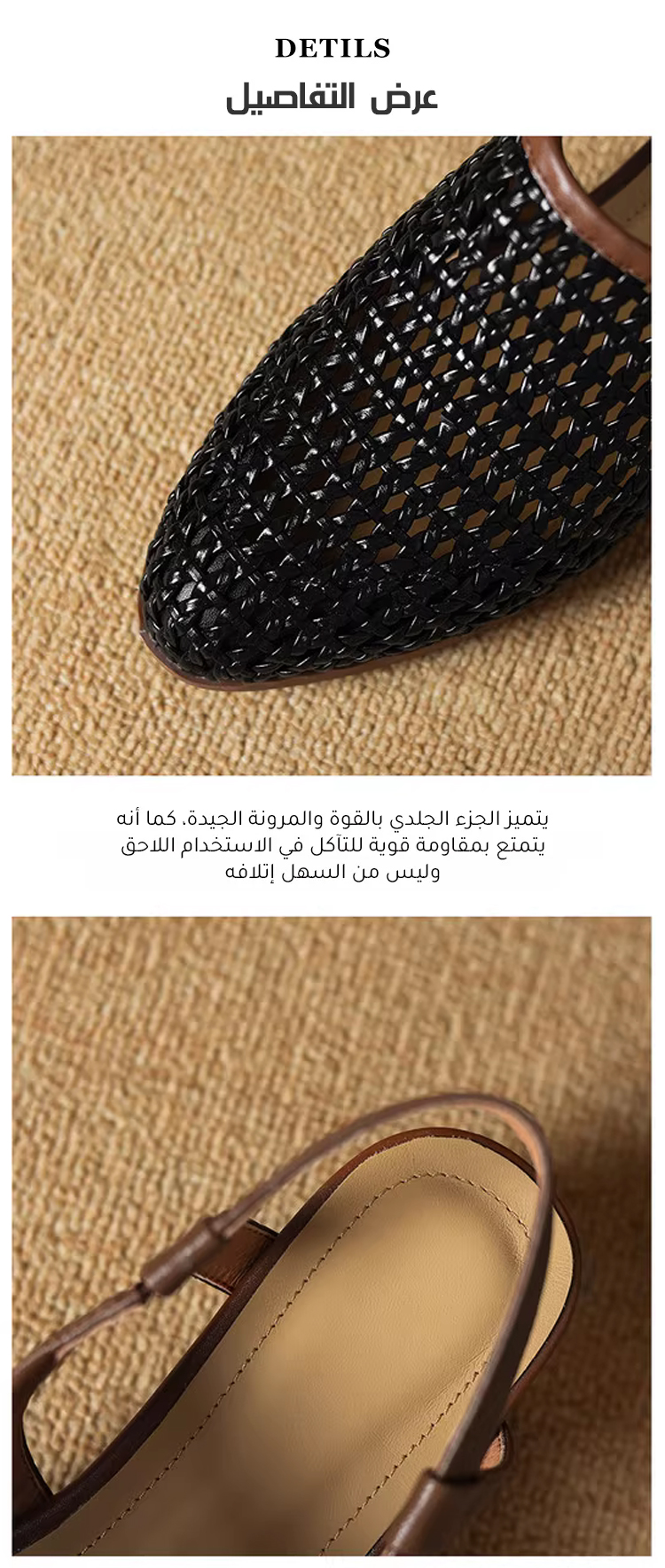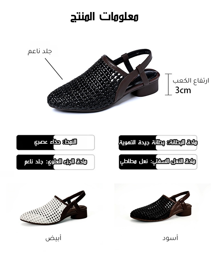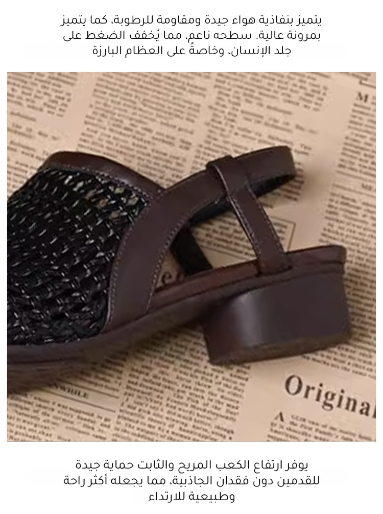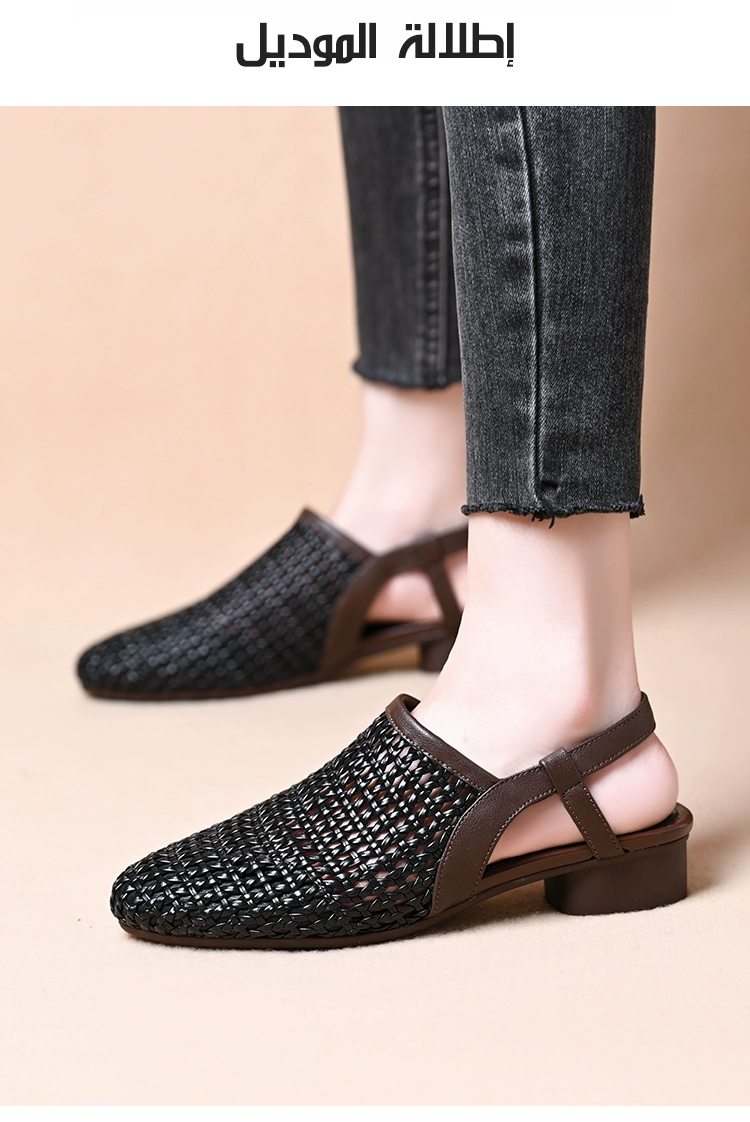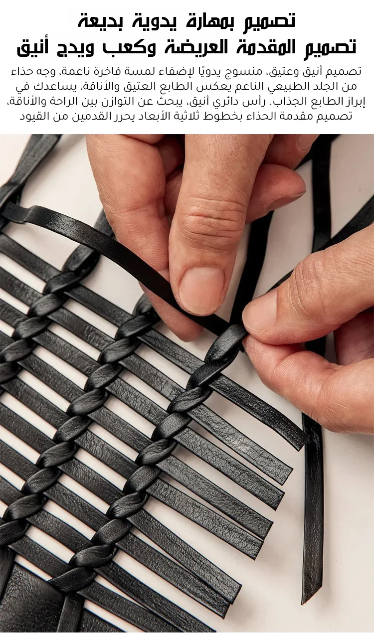 ● مصنوع من جلد ناعم مجدول بشكل متقن، يتكيف بخفة مع انحناءات القدم. مرونته وقدرته على التهوية المتميزة تمنعك من الشعور بالحرارة حتى في درجات الحرارة العالية، مما يضمن راحتك طوال اليوم.