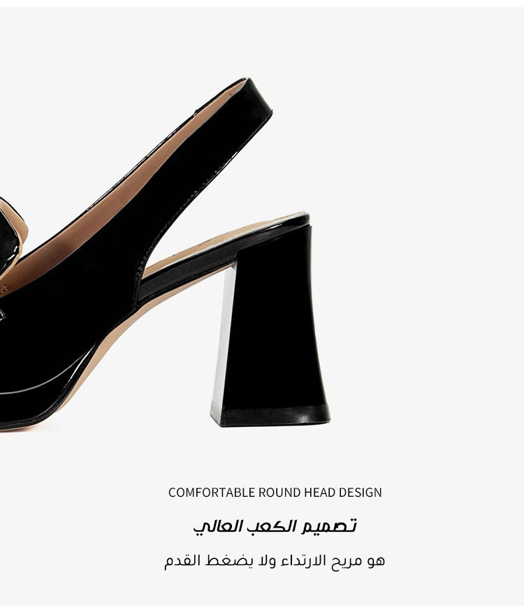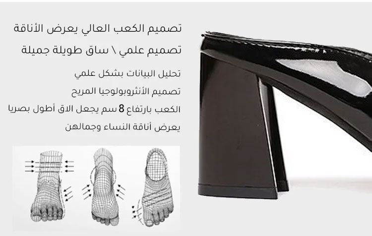 • كعب عريض بارتفاع 8 سم يخلق تأثيراً بصرياً يطيل الساقين ويعزز الأناقة، أكثر ثباتاً من الكعب الرفيع ومناسب للارتداء لفترات طويلة