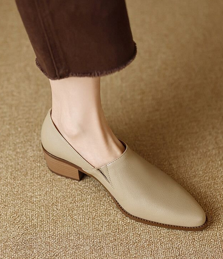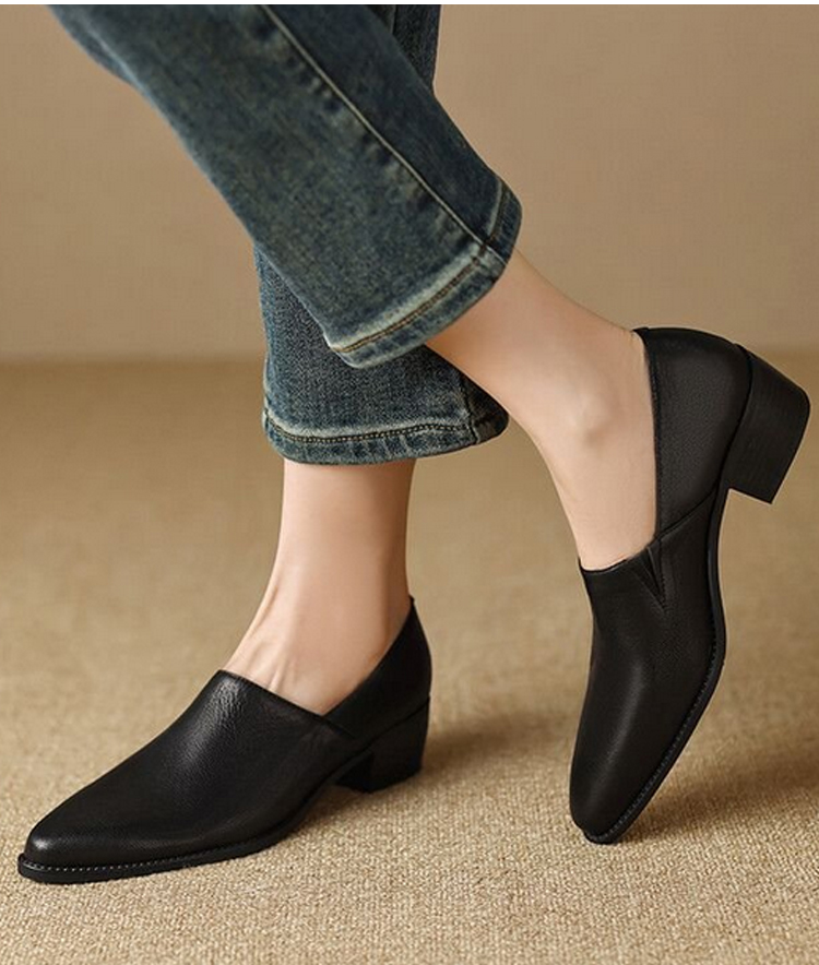 هذا الحذاء الجلدي ذو الرأس المدبب بأسلوب عتيق، المصنوع من جلد الغنم عالي الجودة بالطبقة الخارجية، وجلد البقر بالطبقة الداخلية، مع كعب مربع بارتفاع 3 سم، يجسد حذاء المكتب الأساسي بـ"الأناقة العتيقة + الراحة أثناء التنقل".
