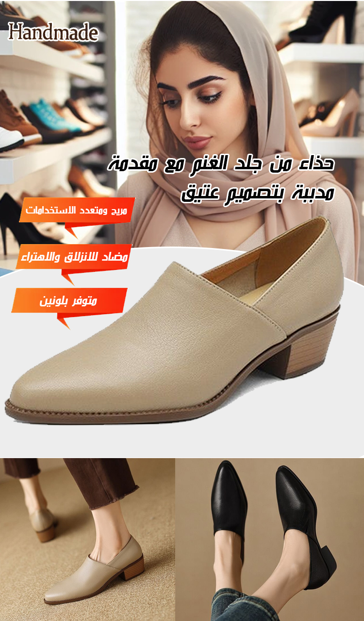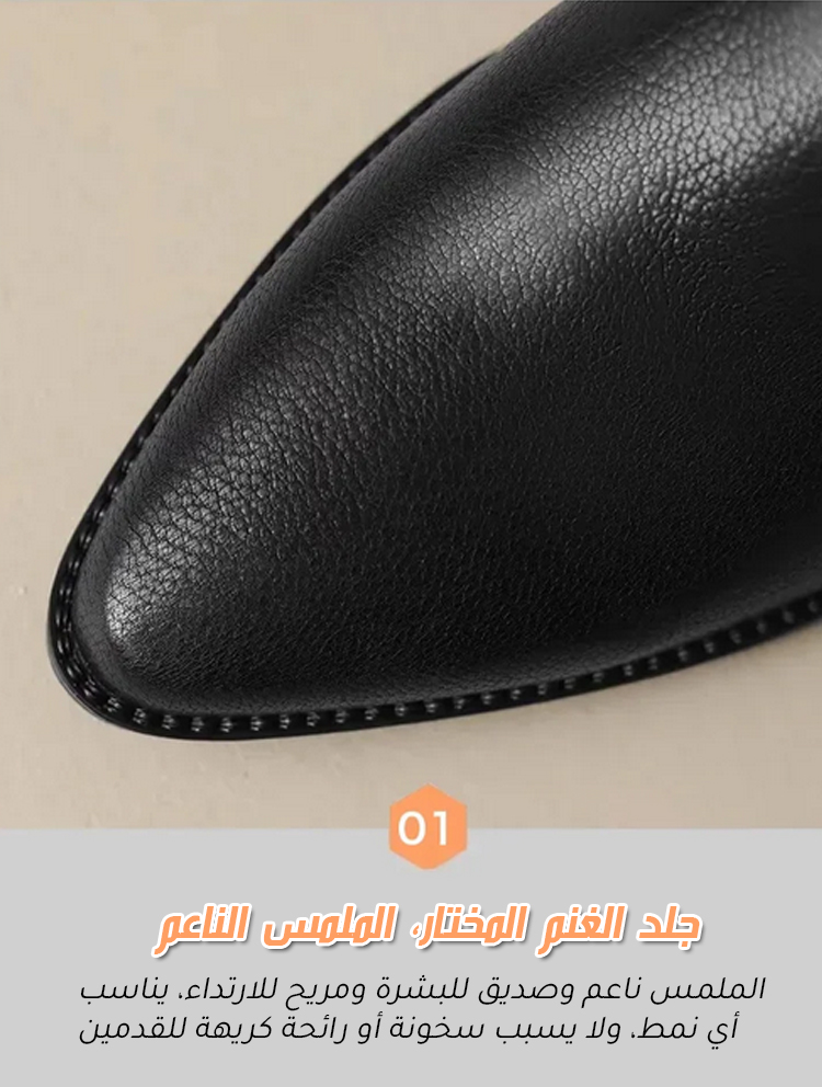 مادة فاخرة ومريحة: الطبقة الخارجية مصنوعة من جلد الغنم عالي الجودة، ناعمة وناعمة الملمس، وذات إحساس عتيق غني؛ البطانة الداخلية من جلد البقر، تتنفس وتلطف البشرة وتقاوم التآكل، مريحة للارتداء لفترات طويلة؛ نعل مطاطي مقاوم للانزلاق وقوي، مع قبضة ممتازة، يجمع بين الأناقة والفائدة العملية.