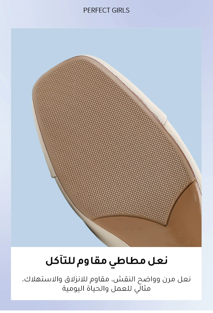 تصميم الحذاء بمقدمة دائرية فرنسية يغطي أصابع القدم بالكامل، ويمنع إظهار الأصابع بشكل مخجل، كما يحميها من الاحتكاك والاصطدام.
