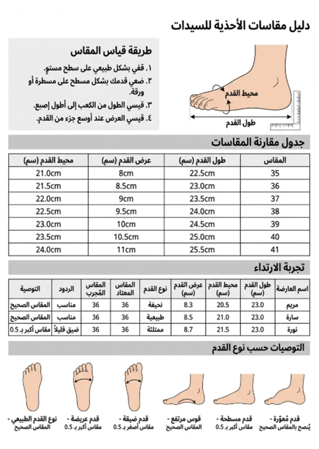 كعب بارتفاع 5 سم مريح وثابت: كعب متناسق مع نعل مطاطي مضاد للانزلاق، يوزع الوزن بشكل متساوٍ، يمنع التعب عند صعود الدرج أو المشي السريع، ويقلل من آلام الكاحل أثناء الوقوف لفترات طويلة.