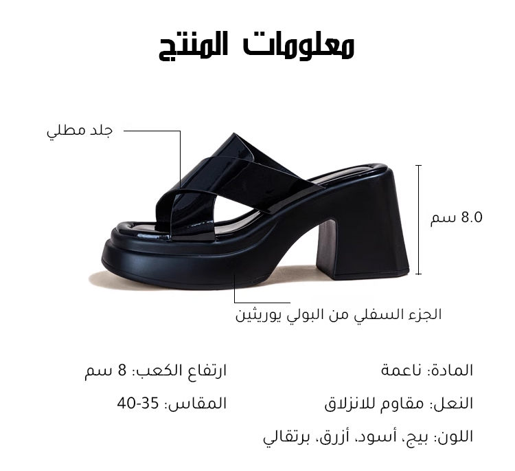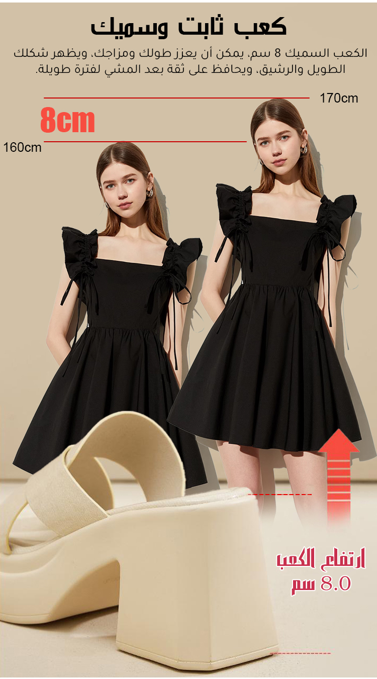 كعب بارتفاع 8 سم، أنيق بدون جهد: تصميم كعب متدرج، انتقال طبيعي من قاعدة الكعب إلى الحذاء، توزيع متوازن للوزن، تجنب الشعور بعدم الراحة عند المشي بكعب رفيع.
