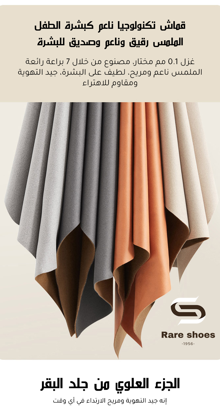 المادة العلوية: جلد المدبوغ المخمل + قماش شبكي قابل للتنفس، يجمع بين المظهر الكلاسيكي والتهوية النعل: نعل مطاطي مقاوم للتآكل + نقوش مانعة للانزلاق، مناسب للأسطح الملساء تصميم النعل: تصميم موسع، مناسب للقدم العريضة للمرأة في الشرق الأوسط |
