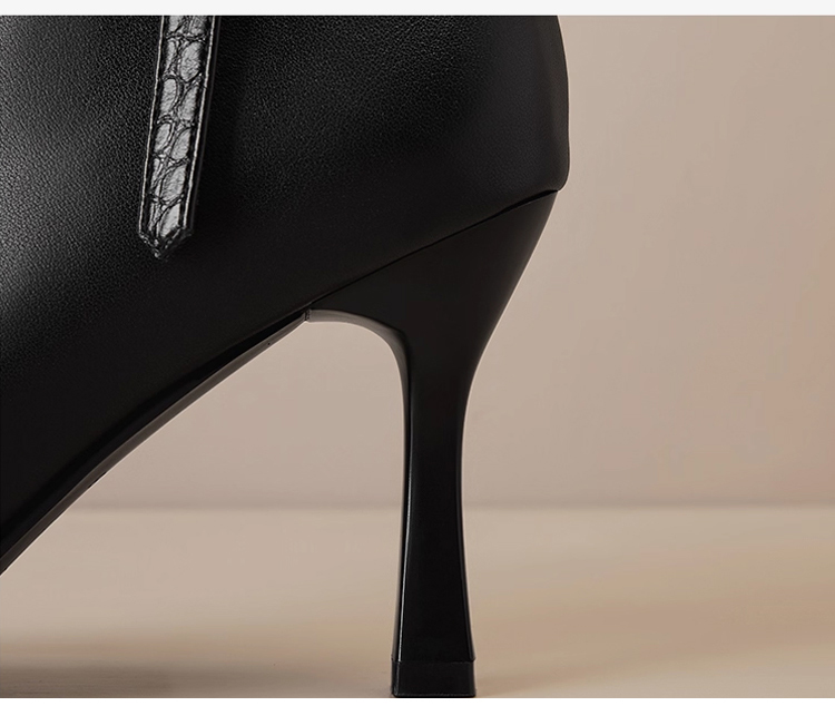 تصميم الحذاء: نمط مدبب يعدل شكل الساق ويطيل خط الساق؛ كعب نحيف بارتفاع 7-8 سم يعزز الثقة، مع ثبات عالٍ في الكعب (لا يسبب التعب أثناء المشي)؛ تجاعيد عند فتحة الحذاء + حزام ملون يكسر الرتابة ويضيف طبقة من الأناقة.