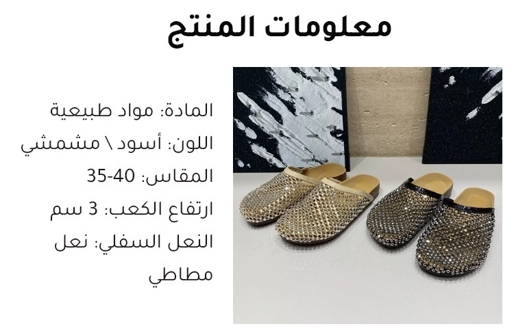 تصميم جذاب مرصع بالأحجار: تغطية كثيفة من الأحجار اللامعة على الحذاء، تلمع تحت الضوء الطبيعي والاصطناعي، مع إحساس بالأناقة والتميز بسهولة تصميم مريح للكسالى: حذاء مفتوح من الخلف يمكن ارتداؤه بسرعة، مثالي للحياة السريعة مواد مريحة: قاعدة شبكية ونعل فلين، يسمح بتهوية القدم ويتكيف مع شكلها، لا يسبب التعب حتى بعد ارتدائه لفترات طويلة تنوع في الأسلوب: تصميم باللون الأسود مع لمعان الأحجار، يجمع بين العملية والأناقة العصرية |