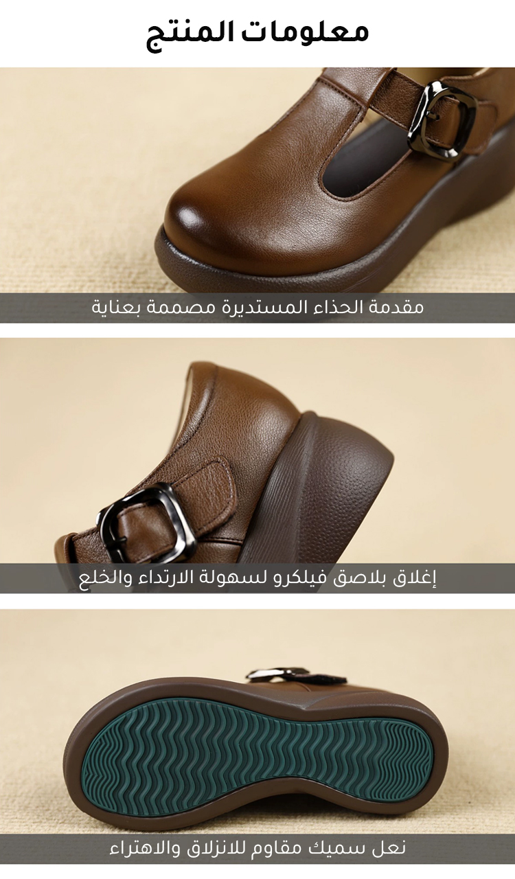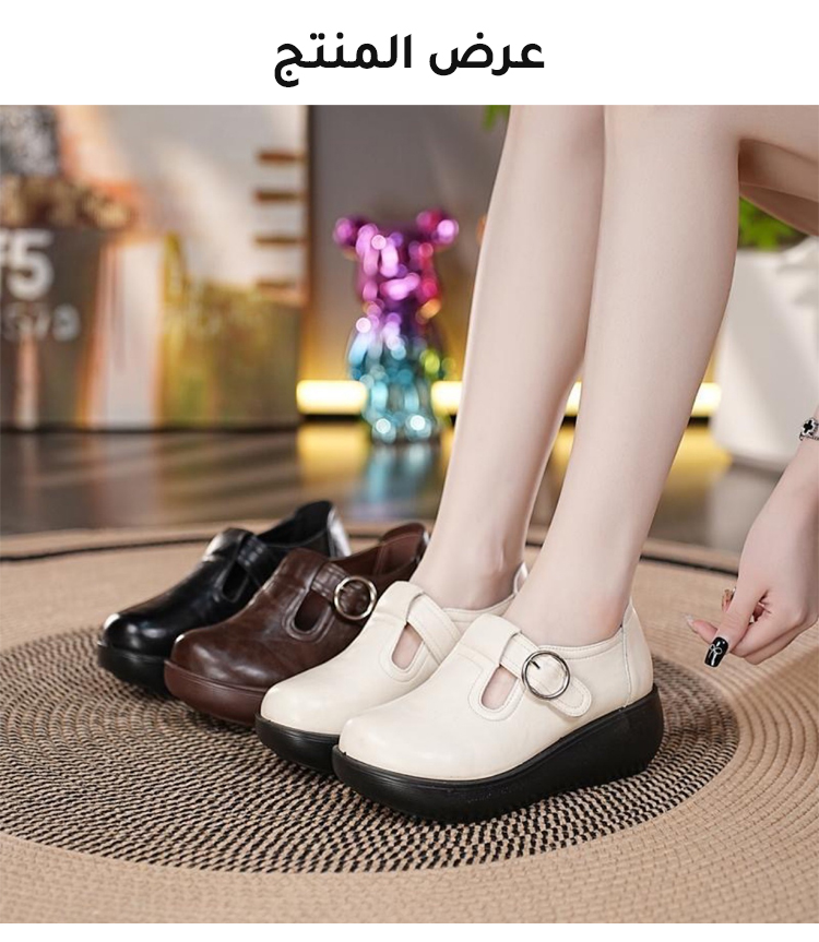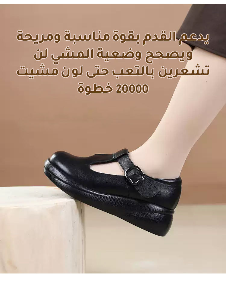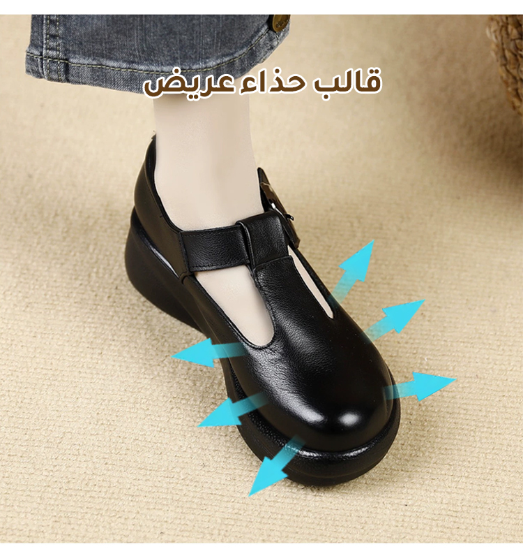 Healthy-foot حذاء جلد بقر طبيعي بكعب 5 سم (مريح جداً للوقوف الطويل والأقدام العريضة) جلد بقر طبيعي فاخر (ناعم ويدوم طويلاً) كعب عريض 5 سم (يمنحك الطول والثبات) نعل داخلي من اللاتكس (يمتص الصدمات ويحمي الظهر)